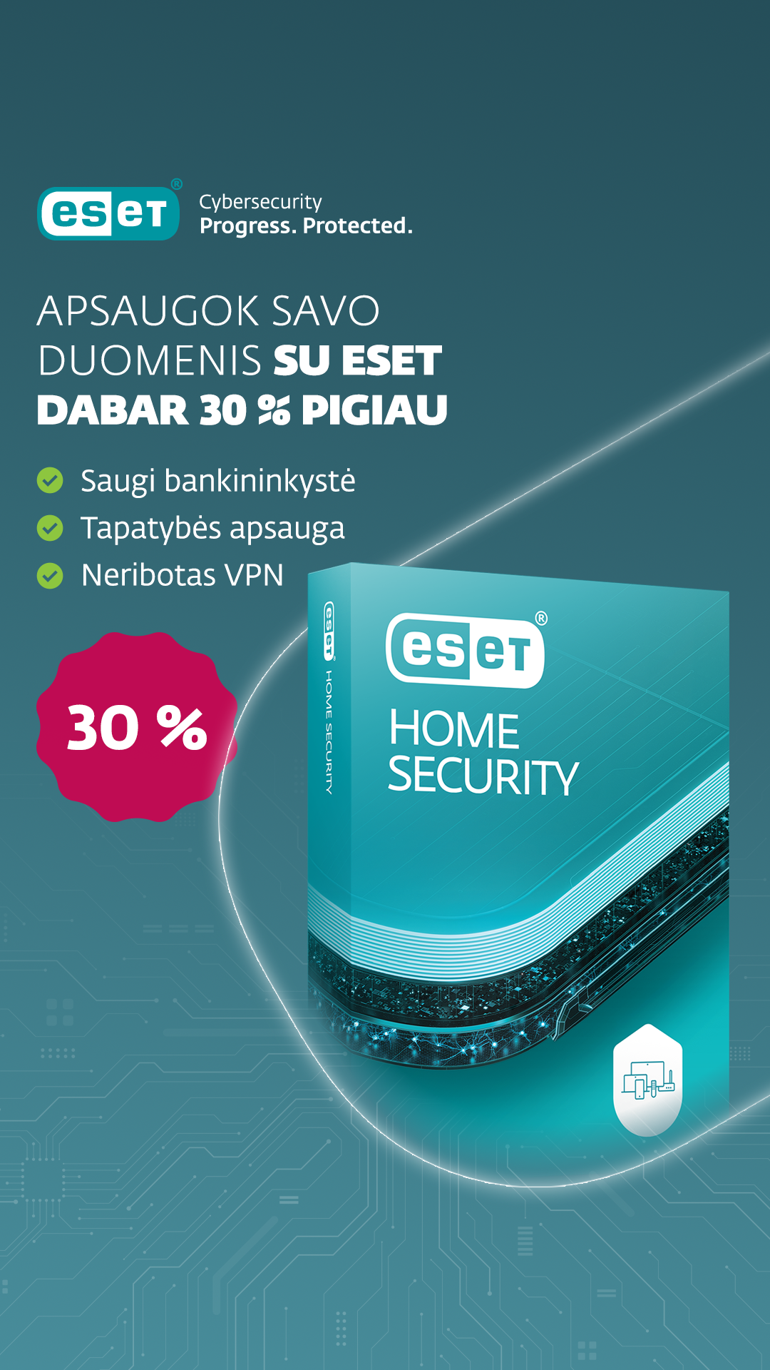 gyvenimui be rūpesčių. Apsaugokite tinklo ryšį ir išlaikykite IP adreso anonimiškumą su ESET VPN. Padidinkite